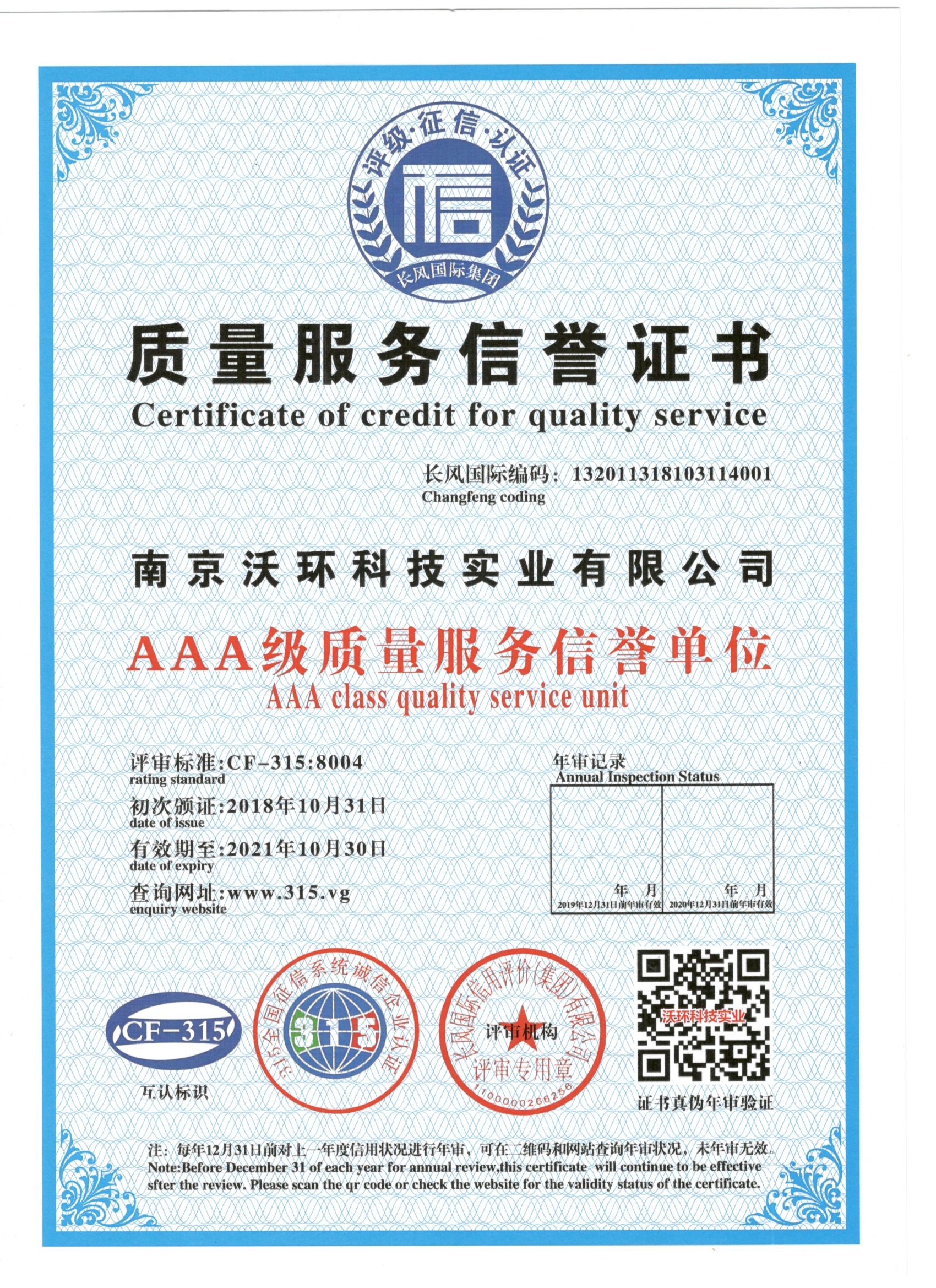 熱烈祝賀南京沃環(huán)公司被專業(yè)評審機(jī)構(gòu)-長風(fēng)國際集團(tuán)評為AAA級質(zhì)量服務(wù)信譽(yù),特發(fā)此證書